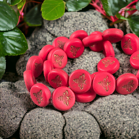 Czech Glass Beads - 12mm Coin Bead with Cute Bumble Bee Matte Red Coin Shaped Beads Nature Theme Beads (COIN/RJ-3953) * Qty. 6