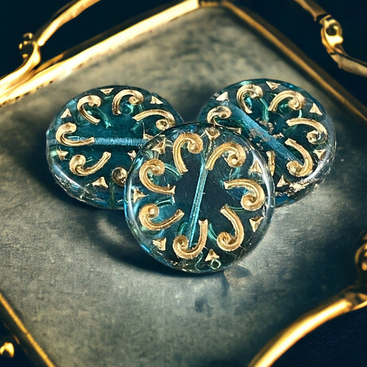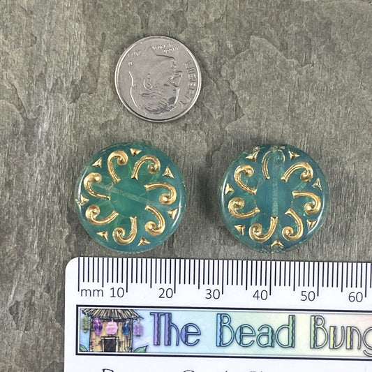 Sun Coin 23mm Czech Glass Beads Aqua with Gold Wash Focal Bead Pendant Bead (C23/RJ-4781) *