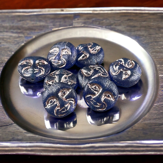 Matte Dark Blue Glass Man in the Moon Moon Face Beads Czech Glass Moon Beads Matte Cobalt with Platinum Wash (MOON/RJ-4749) * Qty. 8