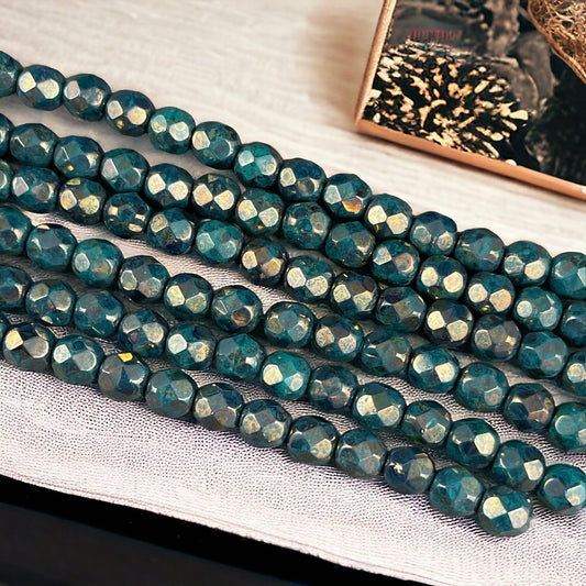 Czech Glass Beads, 6mm Faceted Round Beads - Persian Turquoise with Bronze Picasso Fire Polished Beads (FP6/SM-BT6315) * Qty. 25