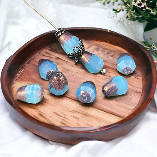 8mm Blue Czech Glass Beads ~ Teardrop Beads ~ Aqua Blue Opaline Teardrop with Purple Bronze Picasso ~ Czech Beads (DRO/RJ-1833) * Qty. 15