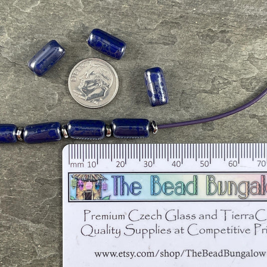 Czech Glass Beads - 14x7mm Large Hole Tube Bead, Cobalt Blue with Silver Picasso Finish, 2mm Hole (TUBE/N-2131) * Qty. 10