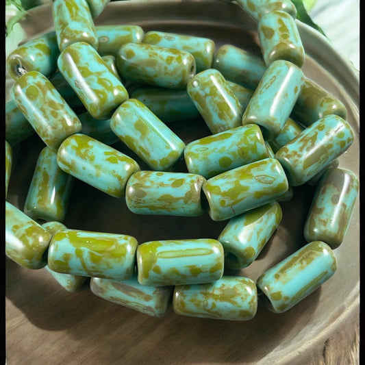 Czech Glass Beads - 14x7mm Large Hole Tube Bead, Tea Green with Picasso Finish, 2mm Hole (TUBE/N-2133) * Qty. 10