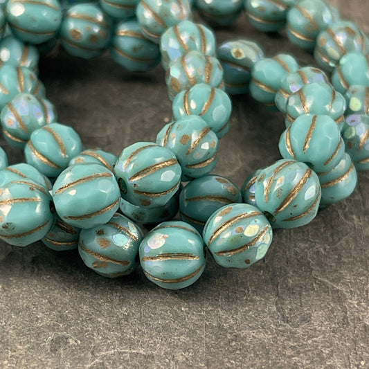 Czech Beads - 8mm Faceted Melon, Turquoise with AB and Gold Wash (8FM/N-1288) * 20 Beads