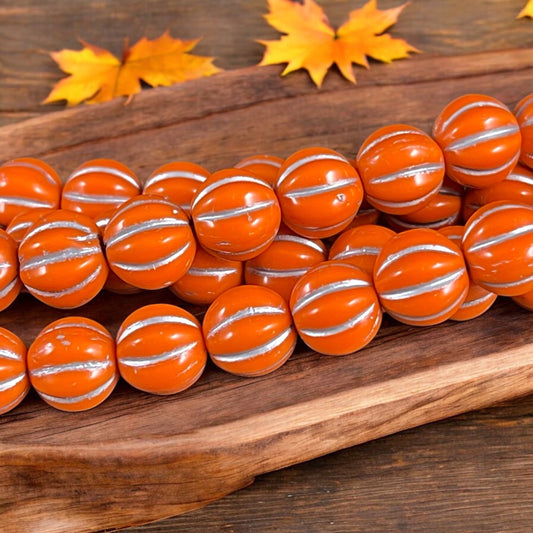 8mm Czech Glass Beads, Opaque Classic Orange with Silver Wash Glass Beads, Melon Beads (ML8/76) * Qty. 15