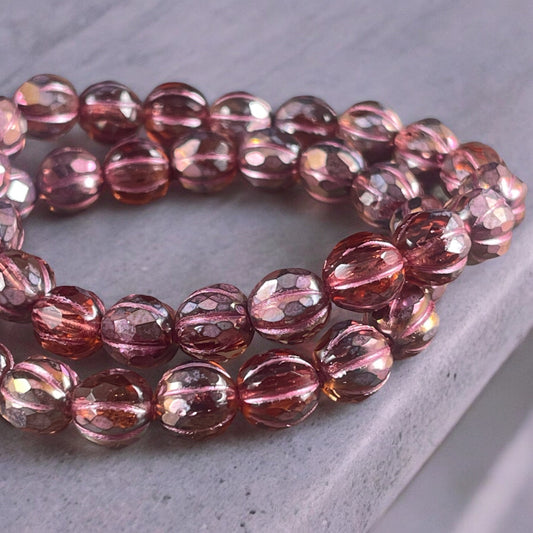 8mm Czech Glass Beads, Transparent Purple, Fuchsia and Clear Glass Beads, Melon Beads (ML8/33) * Qty. 15