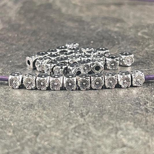 Antiqued Silver Large Hole Square with Flowers, 4mm Cube with 1.8mm Hole (YW0001-17A) * Qty. 50