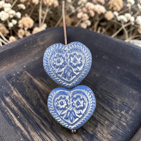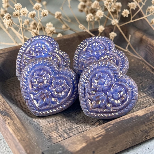 Czech Glass Beads - 18mm Heart Bead, Periwinkle with Silver Wash (FH-12) * 6 Beads