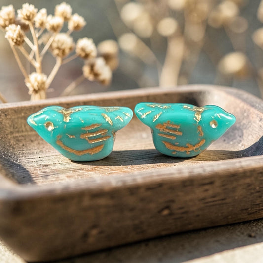 Czech Glass Beads - 11x22mm Chunky Bird, Turquoise with Gold Wash (N-2164) * 4 Beads
