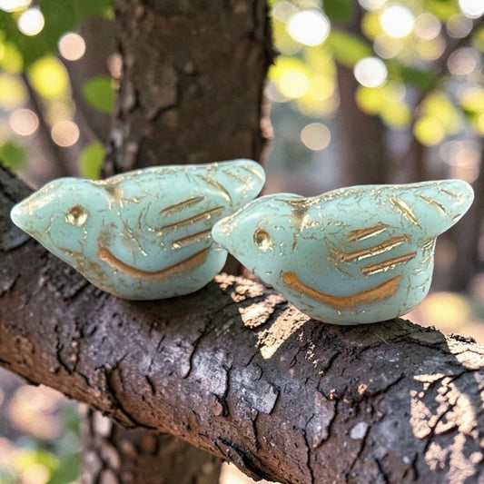 Czech Glass Beads - 11x22mm Chunky Bird, Pale Mint with Gold Wash (N-1618) * 3 Beads