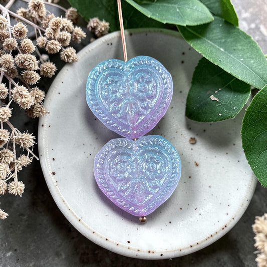 Czech Glass Beads - 18mm Heart Bead, Lilac and Aqua with AB (FH-6) * 6 Beads