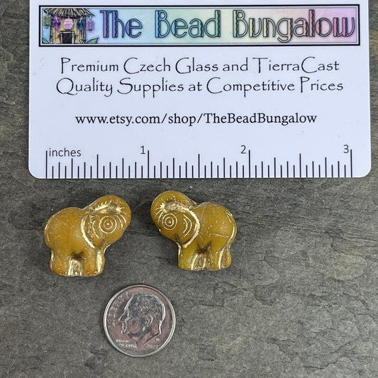 Elephant Bead, Czech Glass Beads, Matte Ocre Elephant with Gold Wash, 20x23mm Mustard Yellow Elephant (Pack8) * Qty. 2