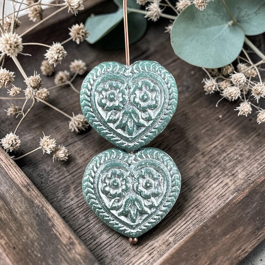 Czech Glass Beads - 18mm Heart Bead, Turquoise with Silver Wash (FH-13) * 4 Beads
