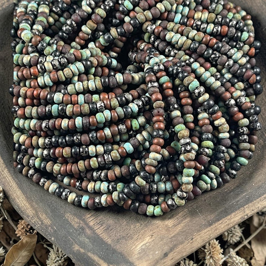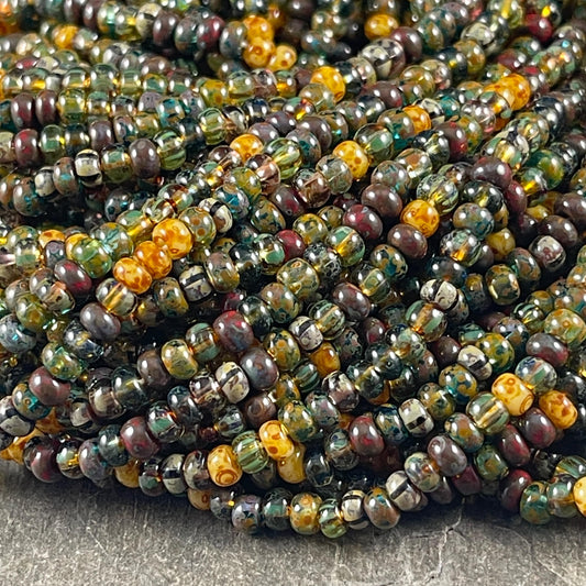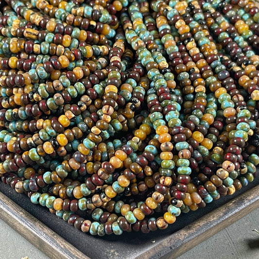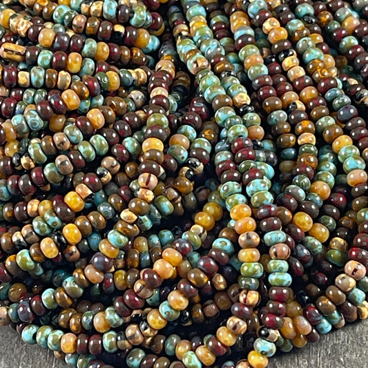 Aged Picasso Seed Beads - 3.5mm Czech Glass, Rustic Earth-tone Mix (7/0-Caribbean) * 20" Strand