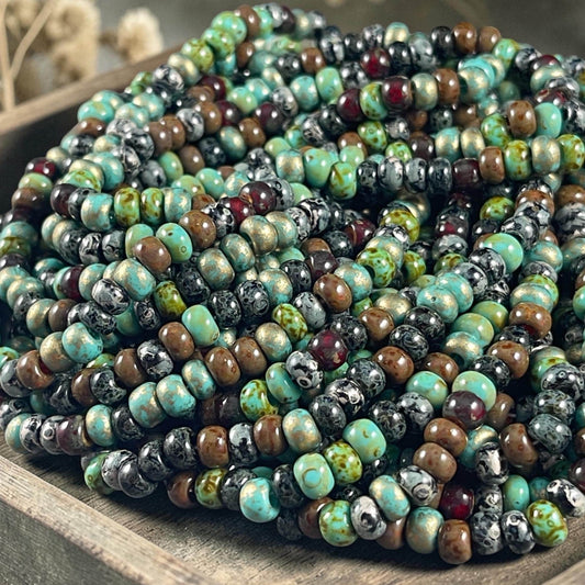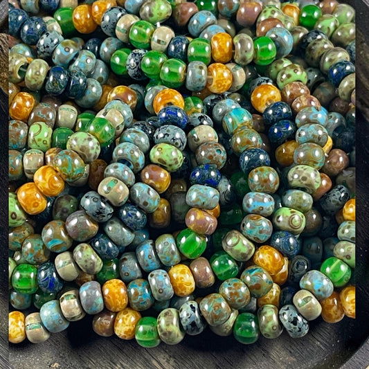 Aged Picasso Beads, 2/0 Czech Glass, Blue, Beige, Green and Black Picasso Bead Mix (2/0-Medusa) * 19" Strand