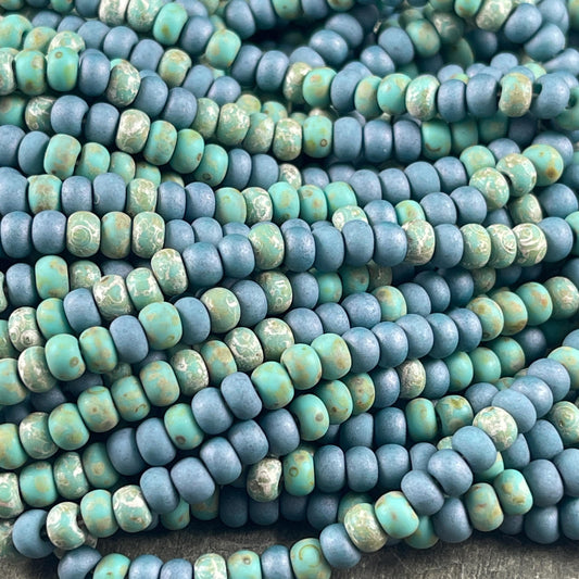 Aged Picasso Beads - 4mm Czech Glass Turquoise and Black Metallic Turquoise Mix (6/0-JeweledMATTE) * 20" strand
