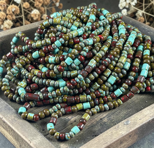 Aged Picasso Beads - 6/0 Czech Glass Mix with Tubes, Olive Green, Turquoise blue and Brick Red Picasso (6/0-DruidBugle) * 20" strand
