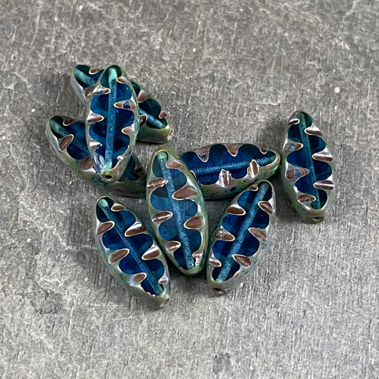 Czech Glass Beads - Capri Blue Oval Beads, Blue Textured Spindle Bead, Capri Blue Picasso Bead, 17x8mm Blue Beads (TSpndl5) * Qty. 8