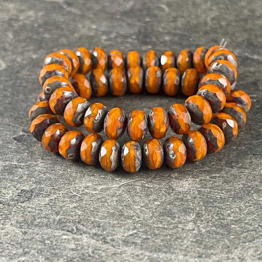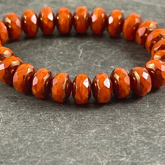 Czech Glass Beads - 7x5mm Opaque Orange Faceted Rondelle, Orange Opaline Glass with Bronze Picasso (R7/RJ-2758) * Qty. 25