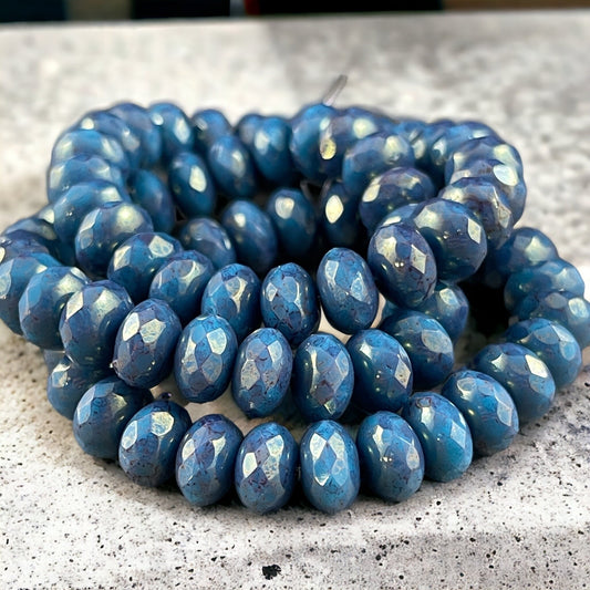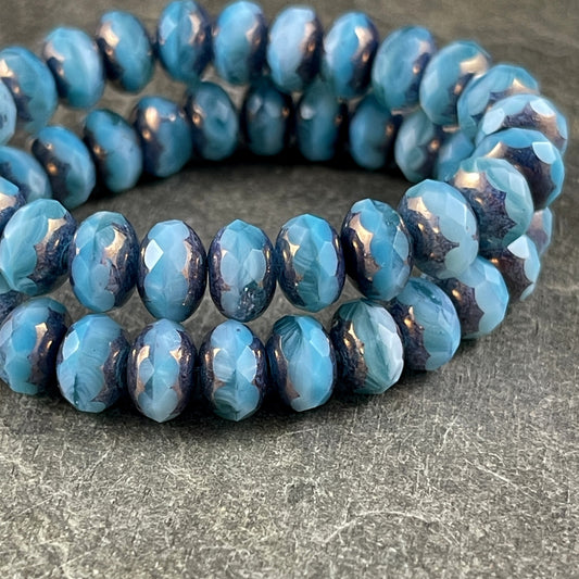 Light Blue Czech Glass Faceted Rondelles ~ 8x6mm Larimar Blue Rondelle ~ Czech Glass Beads with Metallic Picasso (R8/RJ-2710) *