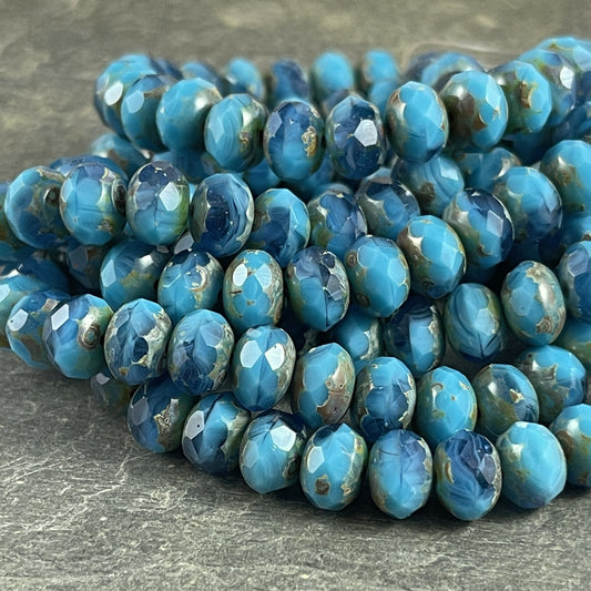 Turquoise Blue Rondelles Czech Beads 8x6mm Rondelle Czech Glass Beads - Turquoise and Capri Blue with Picasso Finish (R8/RJ-2743) *