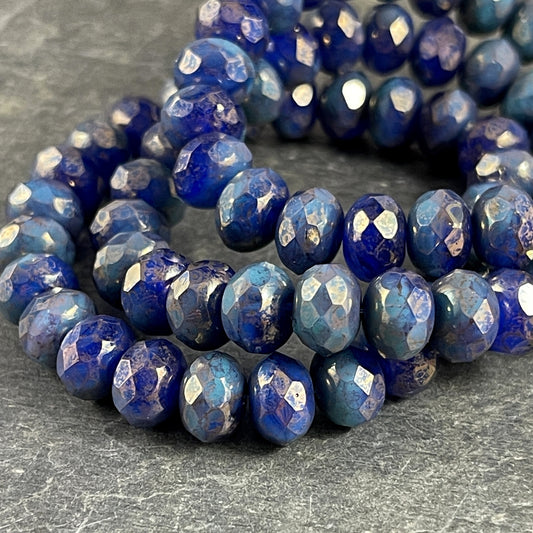 Czech Glass Beads - 5x7mm Navy Blue and Green Faceted Rondelles ~ Cobalt Blue Glass Beads with Full Picasso (R7/OB-101) * Qty. 25