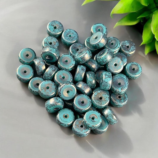 6mm Marbled Turquoise Heishi Rondelle, Czech Glass Beads, Dark Turquoise with Bronze Picasso Finish (HSH/N-0303) * 50 Beads