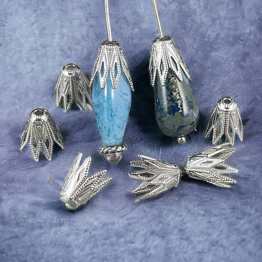 9x8mm Fancy Star, Cone Shaped Bead Caps ~ Bright Silver Plated Brass Tapered Bead Caps (BC-9253) * Qty. 8