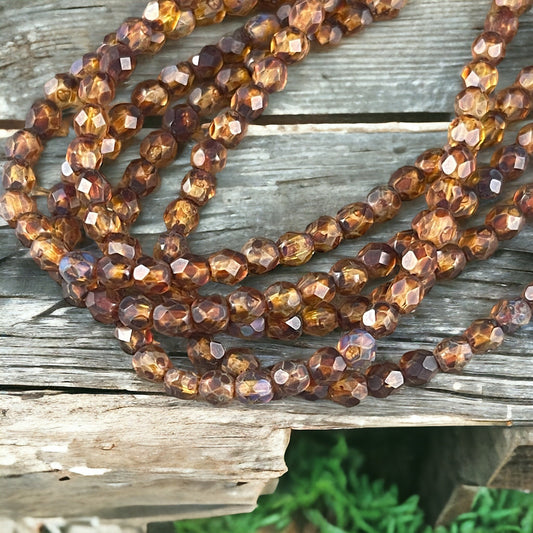 Transparent Gold Czech Glass Beads, 4mm Faceted Round Fire Polished Beads - Light Topaz Celsian, Champagne Gold (FP4/SM-Z1002) * Qty. 50