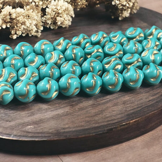 Czech Glass Beads, 8mm Turquoise Knots with Gold Wash, 8mm Opaque Turquoise Beads (Knot5) * Qty. 15